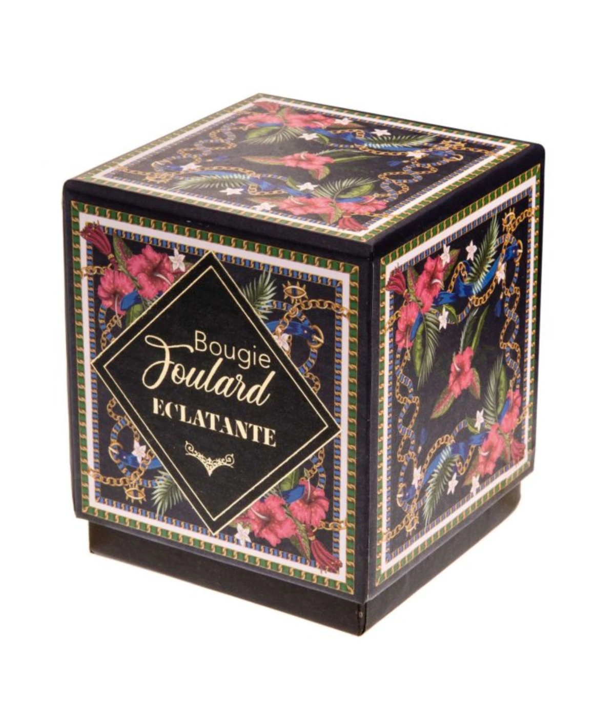 Le foulard aux motifs de la boîte de la bougie est 100% en polyester et mesure 85 cm.