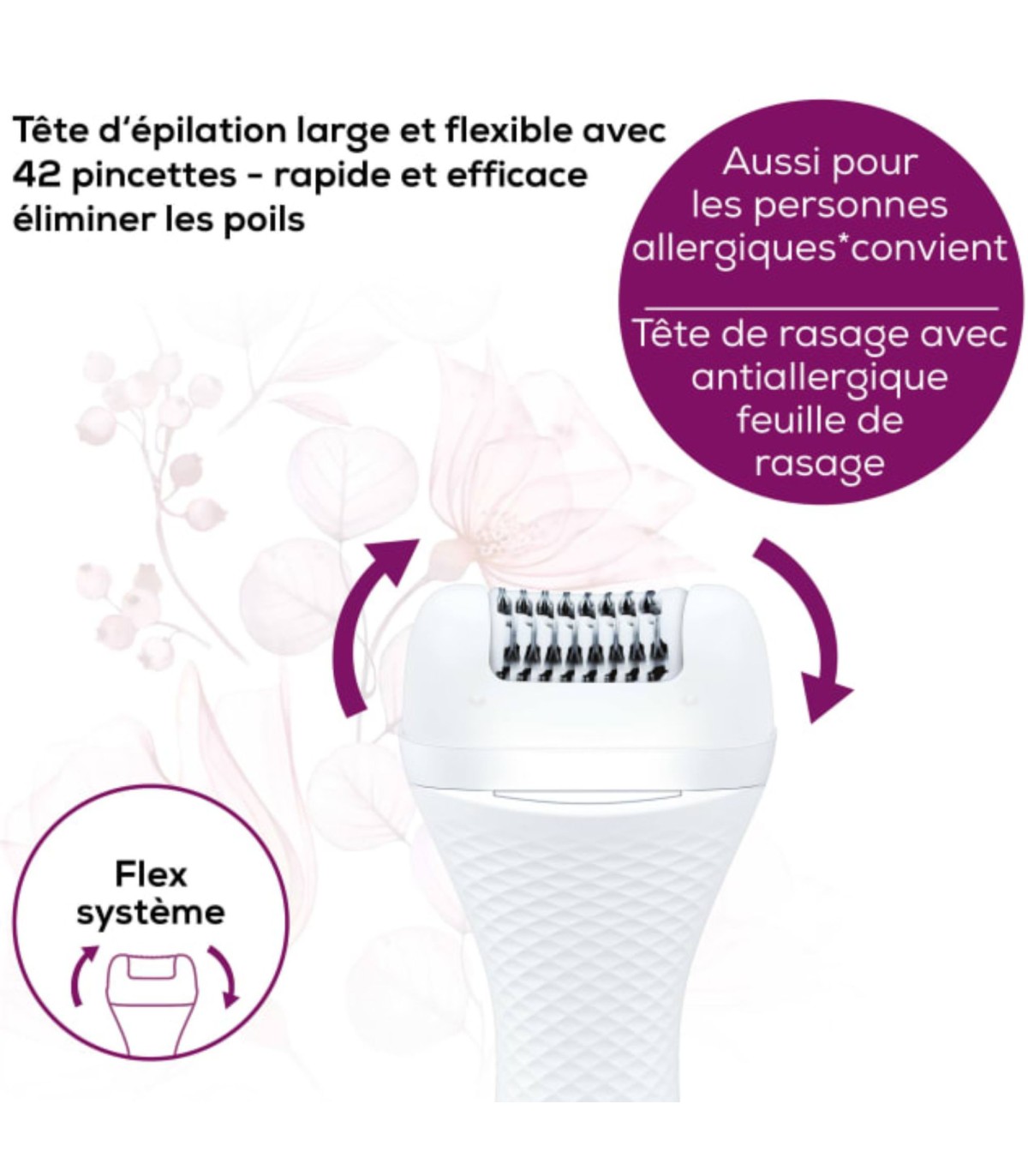 - Large tête d’épilation flexible avec 42 pincettes pour s’adapter parfaitement aux contours du corps