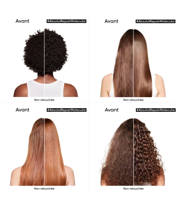 Lors de votre prochaine visite en salon, demandez à votre coiffeur le soin moléculaire longue durée. ****** Protocole Absolut Repair Molecular pour obtenir une réparation moléculaire du cheveu et réparer 2 ans de dommages en 1 application*. Pour des cheveux plus forts, une élasticité & un mouvement restaurés****.