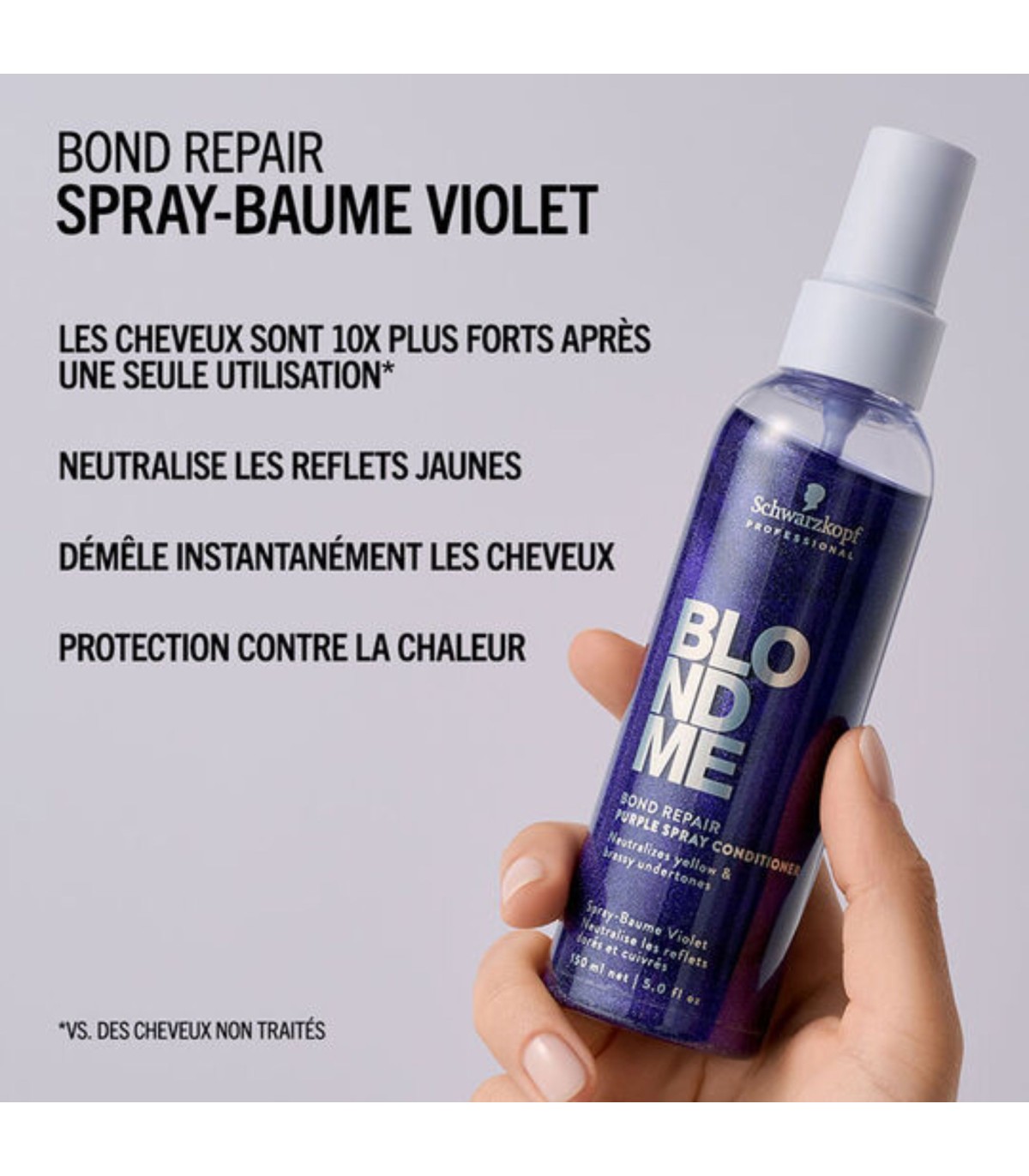 Le Spray-Baume Violet Blondme Bond Repair Neutralisant est un soin sans rinçage spécialement formulé pour entretenir les cheveux blonds froids. Grâce à sa formule déjaunissante, il neutralise les reflets chauds indésirables tout en démêlant et renforçant la chevelure, offrant ainsi une brillance éclatante.